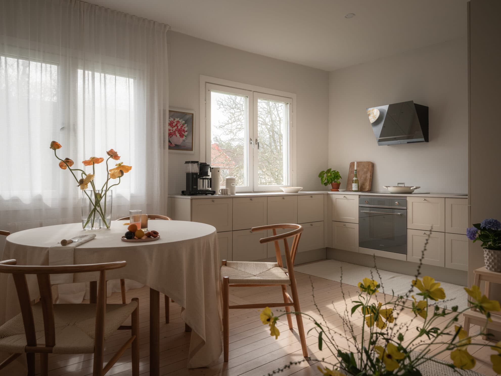Redan vid första steget in möts du av bostadens hjärta – det sociala rummet där kök och vardagsrum vackert flyter samman i en öppen och luftig planlösning. Det stilrena HTH-köket är ett riktigt drömkök för hemmakocken, med generösa arbetsytor, gott om förvaring och en genomtänkt layout som gör matlagningen till ett nöje. De släta luckorna, den smarta designen och de kvalitativa materialen ger ett sobert intryck – här förenas funktion och estetik på bästa vis. Intill fönstret ryms ett matbord för minst fyra personer, perfekt för både vardagsmiddagar och middagsbjudningar. Öppningen mot vardagsrummet skapar en levande känsla och gör det enkelt att umgås, oavsett om du står vid spisen eller slår dig ner i soffan. Det vackra brädgolvet löper enhetligt genom hela lägenheten och bidrar till bostadens charm och varma karaktär.