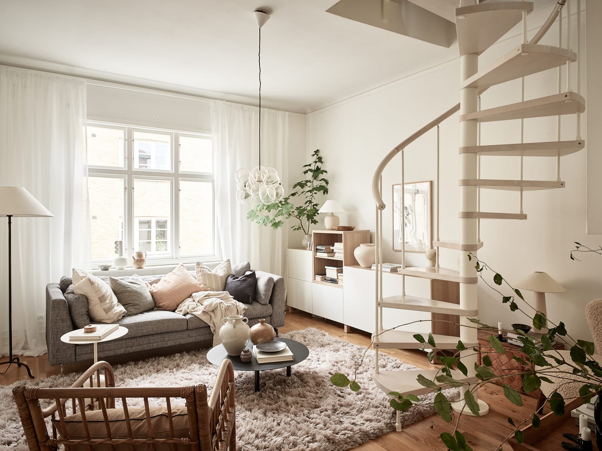 Ett stort sexdelat fönster mot mysiga Erik Dahlbergsgatan fyller lägenhetens vardagsrum med ljus och skapar, tillsammans med den generösa takhöjden, en härligt luftig atmosfär. Rummet är lättmöblerat och det finns gott om plats för soffa, TV-bänk, läsfåtölj och bokhyllor. Väggarna är målade i vitt och ekparkett löper tröskelfritt genom öppningarna mot hallen och köket. En vit spiraltrappa leder upp till lägenhetens övervåning.